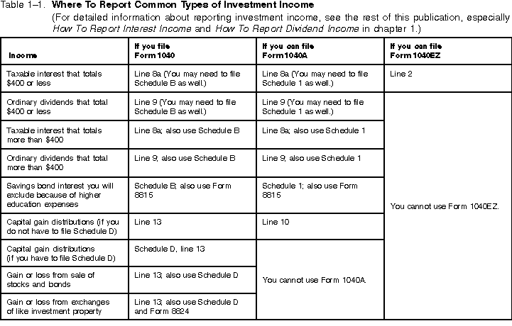 Table 1-1 Where to Report Common Types of Investment Income