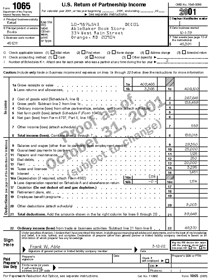 This filled-in Form 1065 is for the AbleBaker Book Store, a partnership composed of Frank Able and Susan Baker. The partnership uses an accrual method of accounting and a calendar year for reporting income and loss. Frank works full time in the business, while Susan works approximately 25% of her time in it. Both partners are general partners.