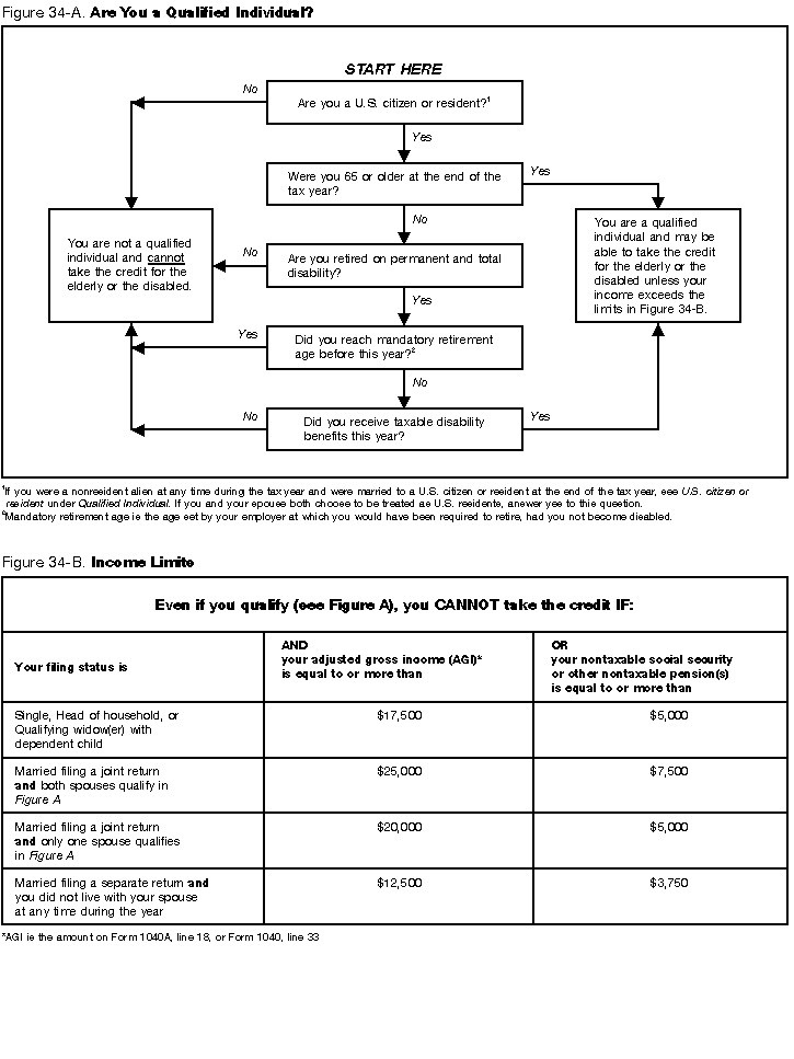 Use Figure 34-A first to see if you are a qualified individual. If you are, go to Figure 34-B to make sure your income is not too high to take the credit.