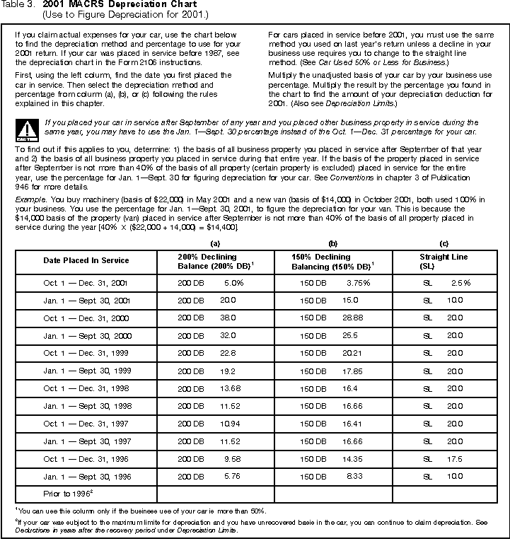 Example. In June 1998, you purchased a car for exclusive use in your business. You met the more-than-50%-use test for the first 3 years of the recovery period (1998 through 2000) but failed to meet it in the fourth year (2001). You determine your depreciation for 2001 using 20% (from column (c) of Table 3). You also will have to determine and include in your gross income any excess depreciation, discussed next.