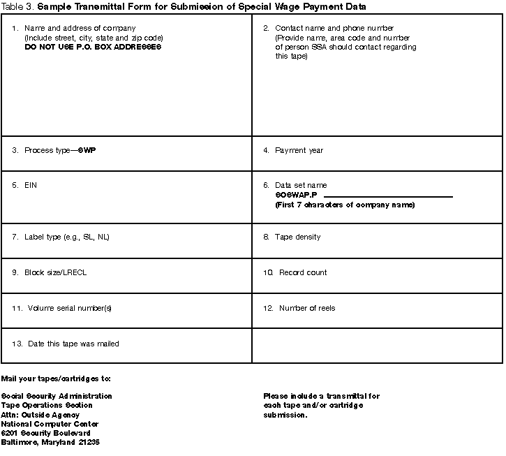 Table 3. Sample Trasnmittal Form for Submission of Special Wage Payment Data